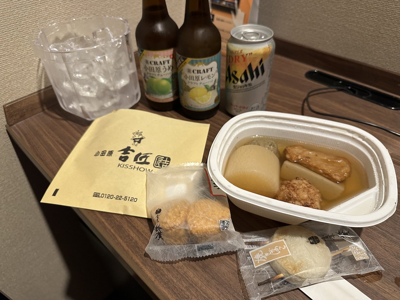 Conveniently located right at the station, you won't have any trouble finding food. We picked up local Odawara chuhai, Odawara oden, and fish cakes for some evening drinks. On the second day, we rented bicycles and strolled around Odawara Castle and the coast.