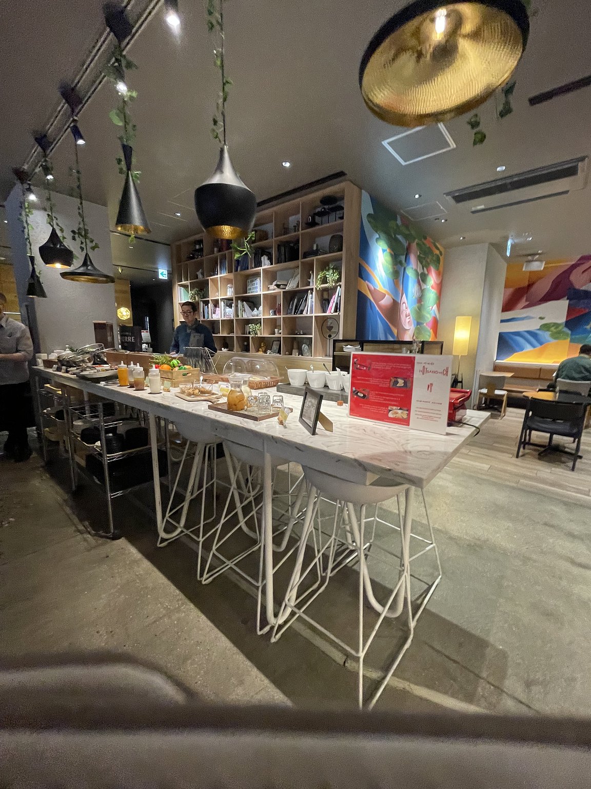 5 minutes walking from JR Umeda Station. The hotel has Umeda's underground shopping area right underneath it, which is a great advantage as we could shop and dine without getting wet, even in the rain. We reserved one twin room and one double room for our family of four. The double room was very compact, and we couldn't open a large suitcase in it. Amenities were minimal. I was pleased to find a shirt-style pajama. Coffee and tea were also available. Since it's new, the wet area is also clean. The bath only has a shower. It's compactly organized and very easy to use. We added breakfast for an additional charge. Even though the venue is compact, there were many options, and as it is from a French company, there were various types of bread. It was very delicious.