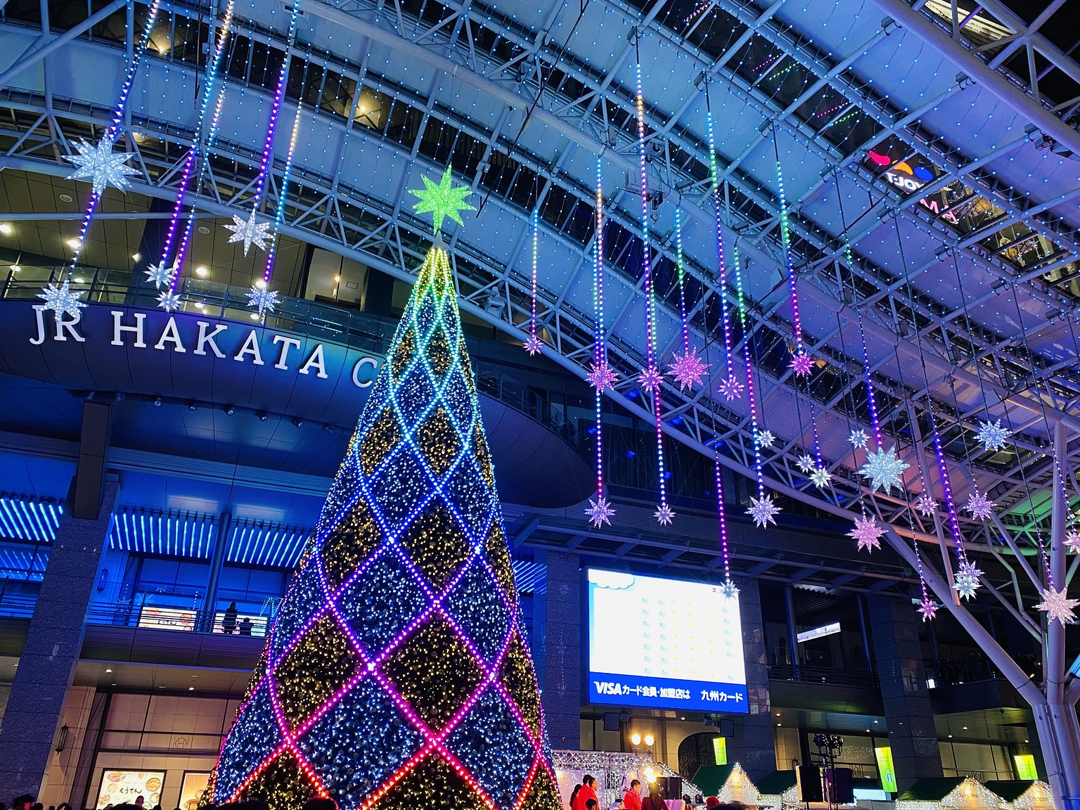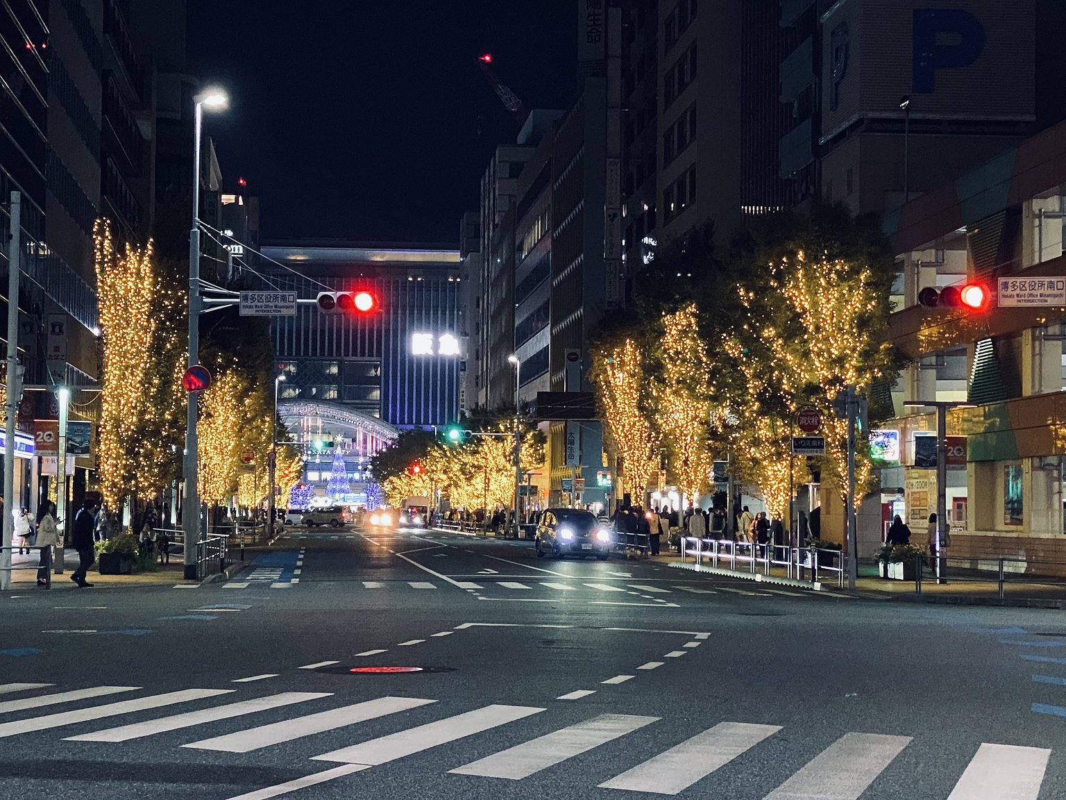 I visited the area around Hakata Station in early November, and the city was beautifully lit up with extravagant lights just before Christmas! A giant tree and tunnels of illumination spread out in front of the station, making me forget the cold with all the sparkle. Every time people gathered, there were exclamations of "Wow!" that made me excited just by watching. After enjoying the lights, I headed straight to a ramen shop for dinner! I was so hungry that I forgot to take photos, but Hakata ramen is the best. The rich tonkotsu broth clung to the thin noodles, and I ended up finishing the soup entirely. After that, I took a leisurely stroll in the night wind. When I looked up, the windows of the buildings were decorated with Santa and tree ornaments, making the whole city feel like it was eagerly awaiting Christmas. It turned out to be a lovely night that warmed my heart. I want to come back to Fukuoka again.