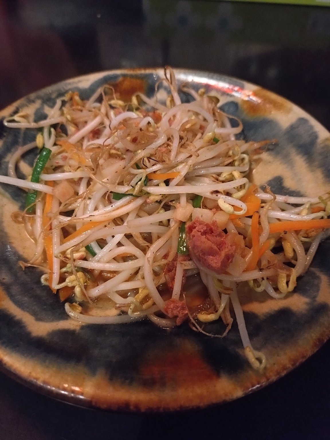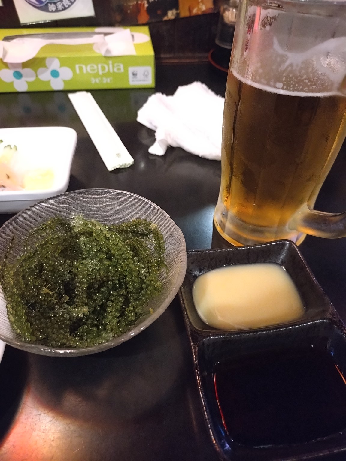 At night, I enjoyed Orion beer, Awamori mixed with water, sea grapes, tempura of mozuku, and champuru at a nearby Okinawan restaurant. Four drinks and four dishes cost me 4500 yen, which was reasonable.