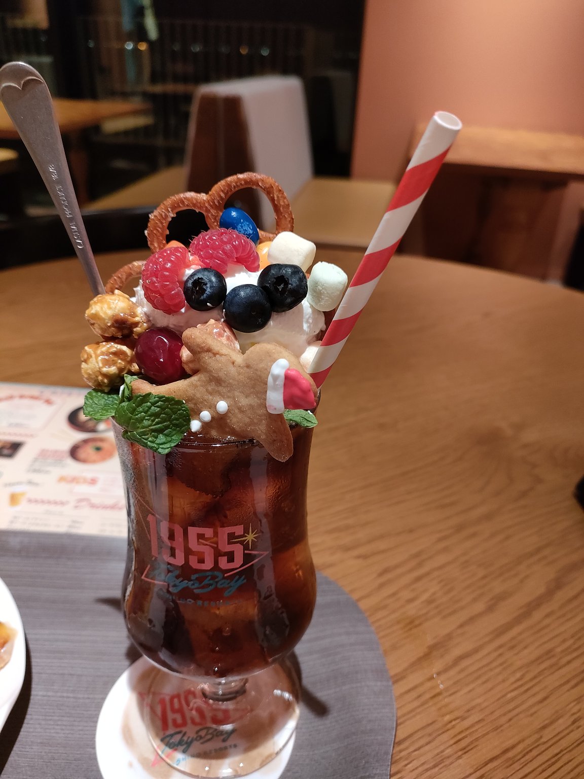 At the restaurant, I had cola with ginger syrup, topped with ice cream and whipped cream, allowing me to add as many toppings as I liked.
