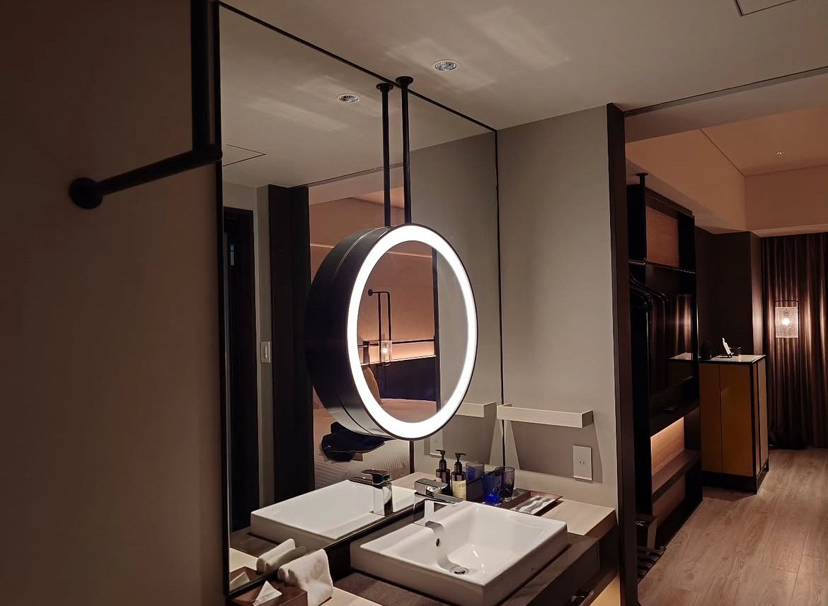 As mentioned earlier, various art pieces are scattered throughout. The interior features many modern elements, creating an atmosphere where simply being in the room is satisfying! The mirror in the room is circular, lighting up from the sides like in a five-star hotel. It's great for makeup and taking photos together.