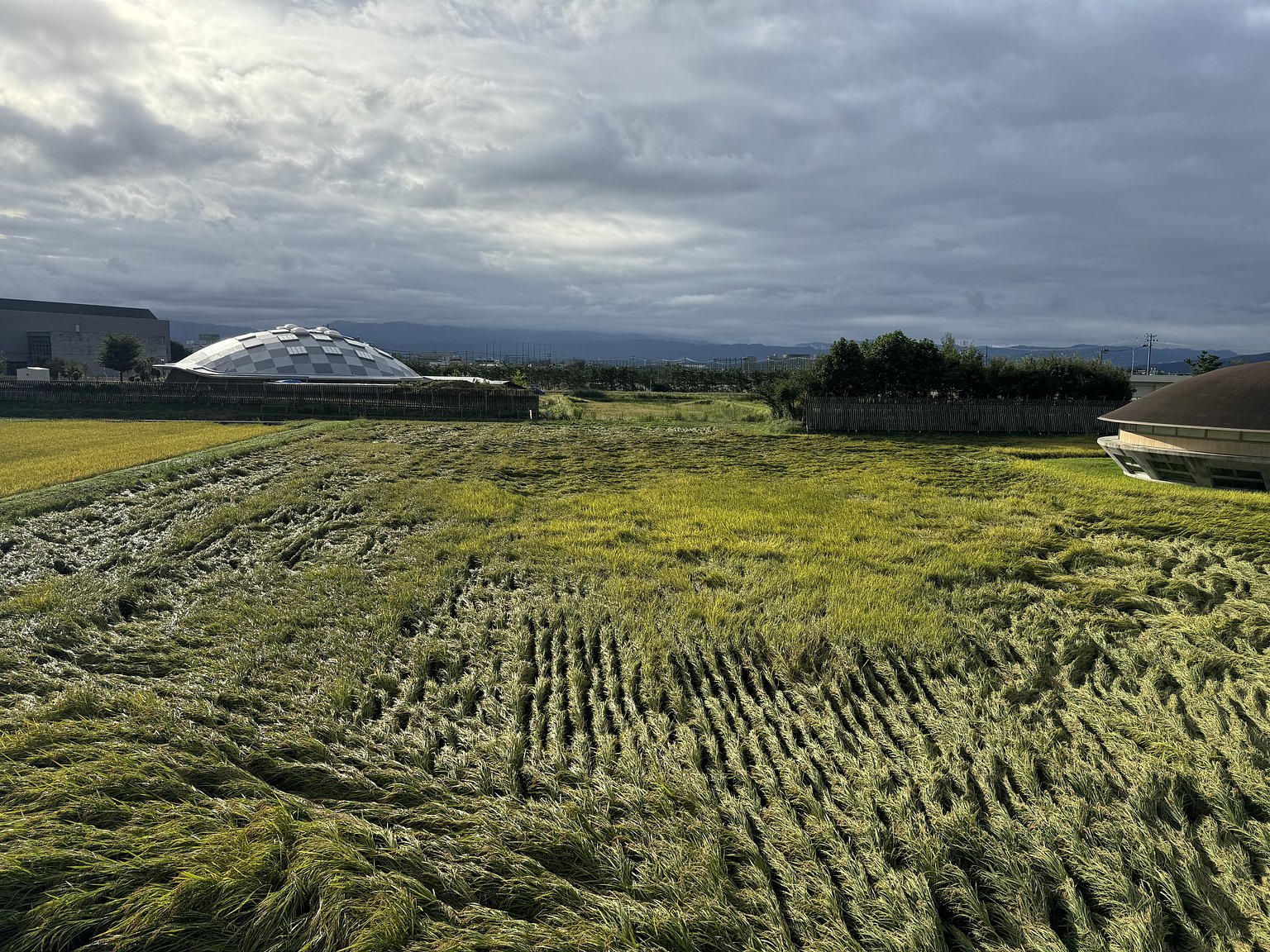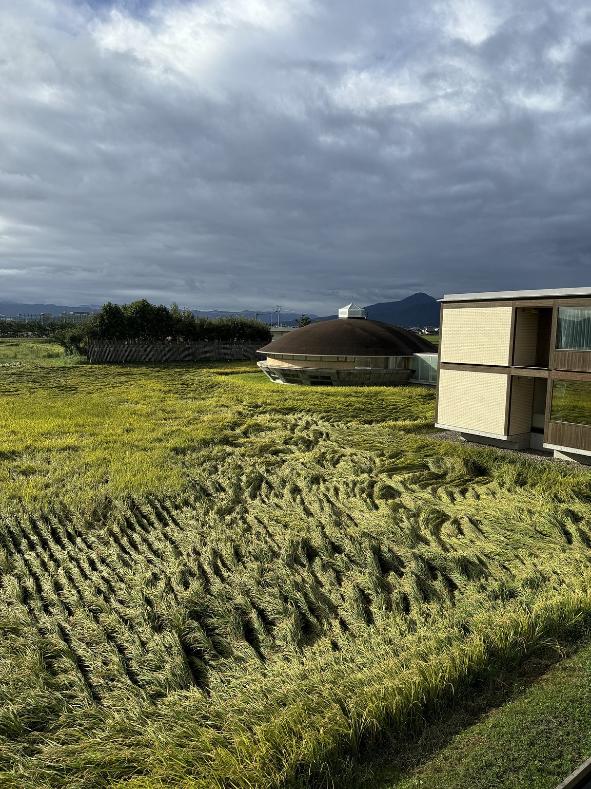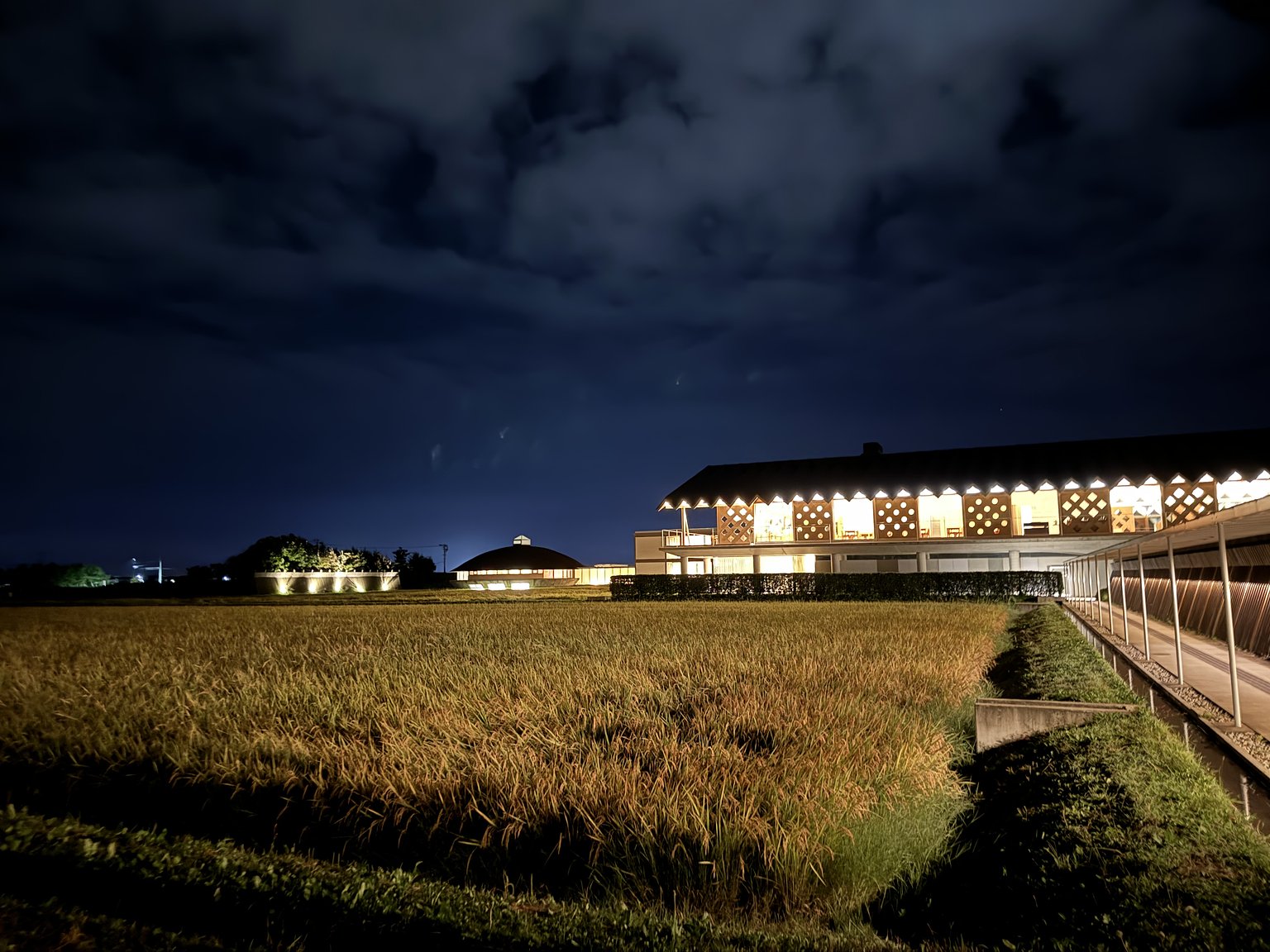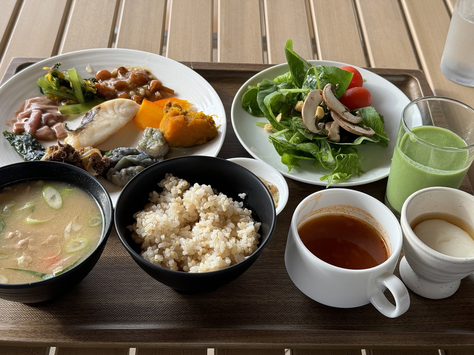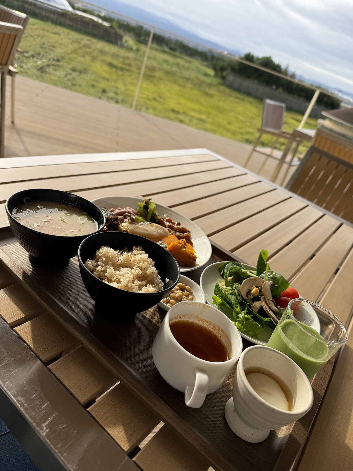 As the name Suiden Terrace implies, this hotel is built in the 'rice fields'! When the fields are flooded, it seems to float on water. When the rice ears are ripe, you can see a view reminiscent of the last scene from 'Nausicaä of the Valley of the Wind'. When I went, the rice ears swayed in the wind, shimmering gold! You could even make staying at this hotel your goal for visiting. Inside the hotel, there is a library and a sake bar. The lobby is spacious and also filled with many books! The view from the hot spring is of the rice fields too! Just relaxing and watching the changing scenery from morning till night can be refreshing. And the breakfast here is highly recommended. Even with a HafH stay, breakfast is included. The vegetables and yogurt from the Shonai region were very delicious. Unusually, you can also enjoy the glutinous brown rice known as Tsuyahime. Be sure to have it on the terrace!