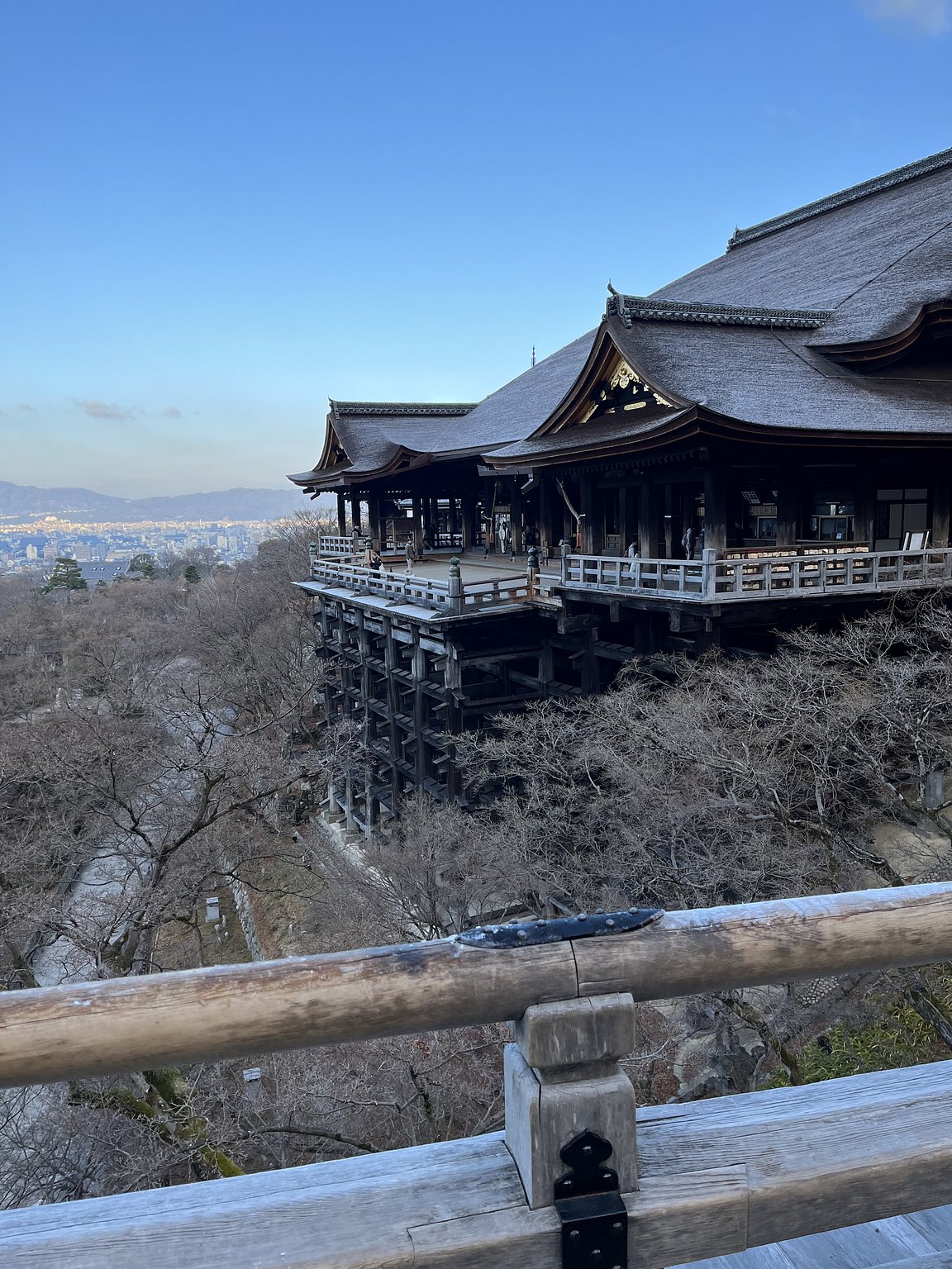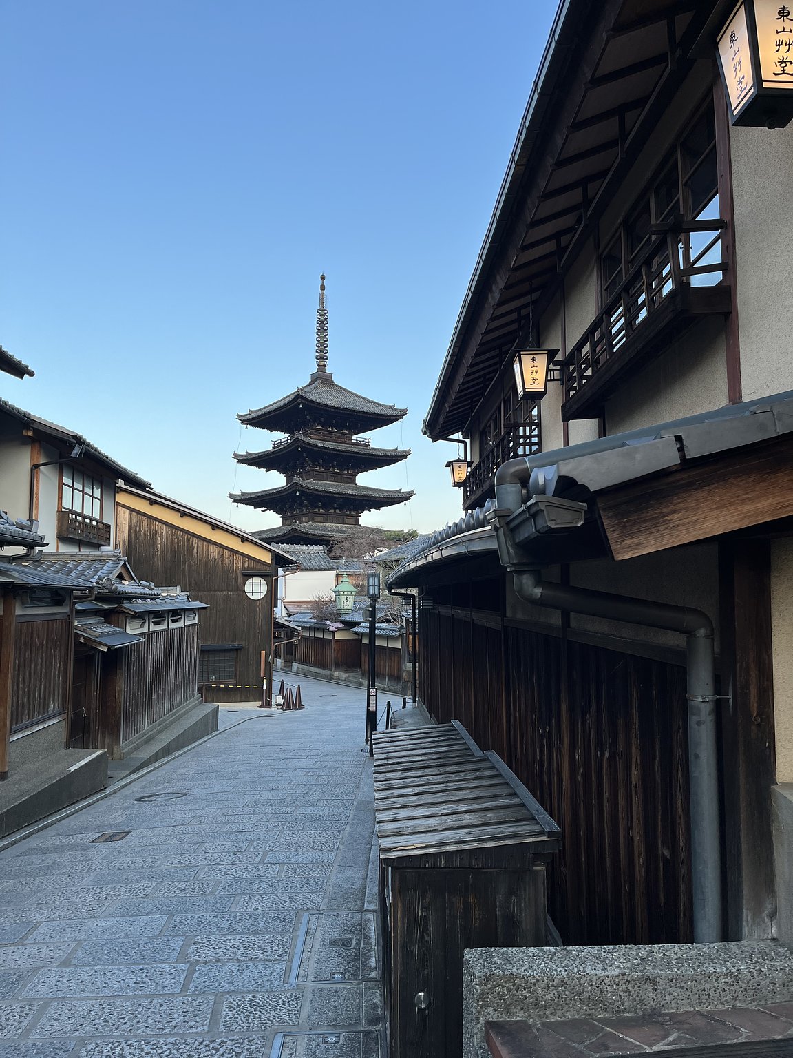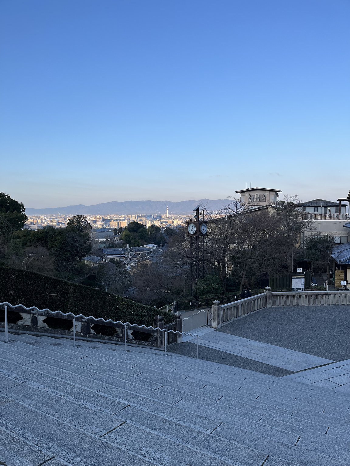 The day after I stayed was Sunday, and I thought tourist spots would be crowded. So, I woke up early for a morning stroll in Kyoto. Kiyomizu-dera opens at 6 a.m., so I couldn't wake up that early, but I set out by 6:30. Enjoying the view of the five-story pagoda at Yasaka Shrine, I headed to Kiyomizu-dera. There were quite a few people, but the refreshing morning at Kiyomizu-dera made me feel divine.