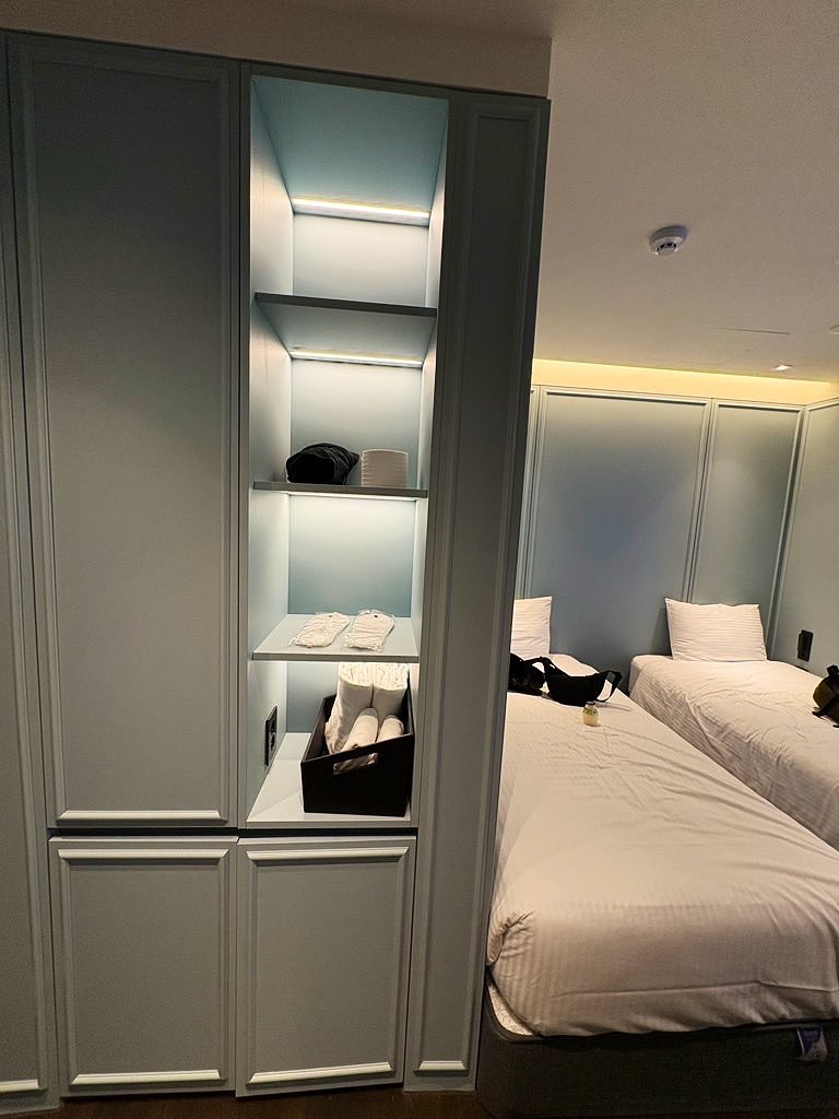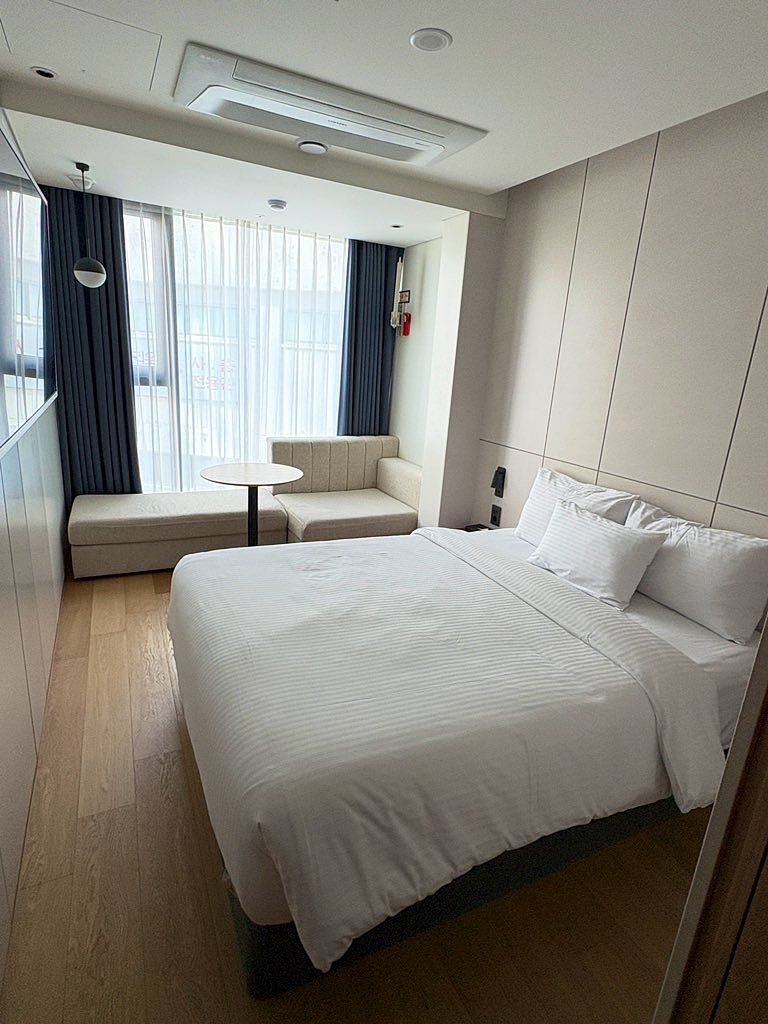 It was a convenient location. I had to arrive at Gimpo at 6:00 AM the next morning, so we stayed here to catch the first taxi to Seoul Station. ■ 3 minutes walk from Jongno 3-ga Station Excellent access from the station. ■ Also close to the airport limousine bus stop (From Incheon Airport, get off at 6002 Jongno 2-ga) ■ Convenient as you can use subway lines 1, 3, and 5! ■ Plenty of restaurants around the hotel, and at night, the streets become overflowing with young people, with many izakayas! Fun. ■ The hotel has luggage storage before and after check-in. ■ The front desk staff was fluent in Japanese, which was very helpful → they called a taxi for us using KAKAO in the morning. ■ There was a convenience store directly connected on the first floor, which was very convenient. [Room] ■ The room was small but clean. ■ The room's interior color was cute. ■ No room keys, password system instead. ■ The twin room had a mysterious raised area. ■ The double room had a sofa. ■ The shower room was hard to use! → There was almost no partition, so the floor got completely wet up to the toilet. That was tough. ■ Slippers and bathrobes were provided, but no loungewear. → No toothbrushes or anything like that.