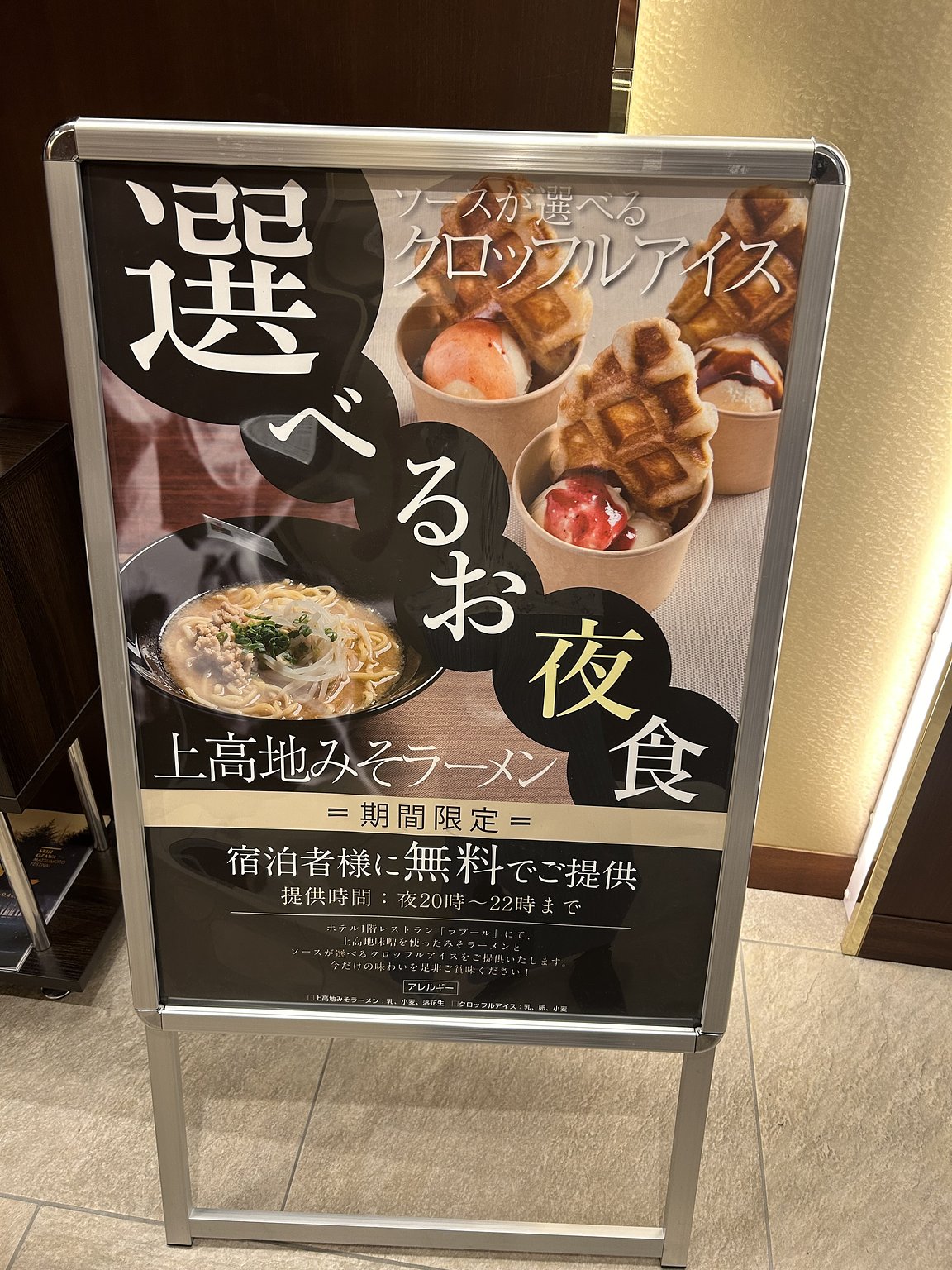 기간 한정으로 저녁 8시부터 10시까지 숙박 고객에게 "선택 가능한 야식" 서비스가 실시되고 있었습니다.