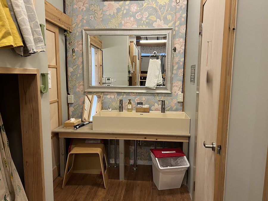 ・여성 기숙사 내에 세면대, 샤워기 및 스타일링 도구가 있음