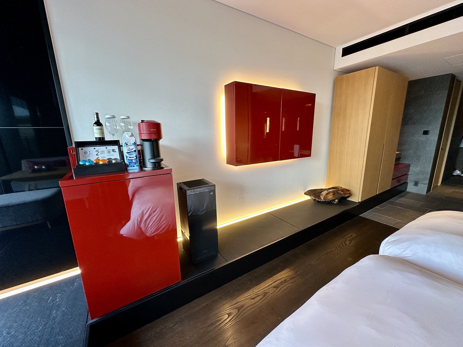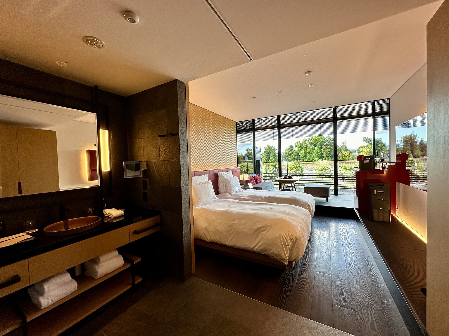 객실은 칠기 도장된 빨간색과 검은색이 인상적인 일본 모던 인테리어입니다.