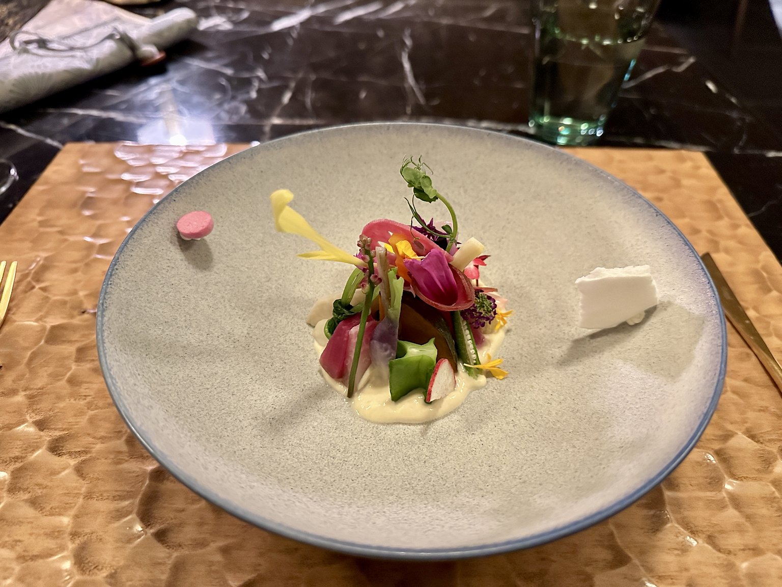 전채의 '상자 정원'은 꽃밭 같은 아트한 접시이며, 치요 두부점의 고급 두유 소스가 맛있습니다.