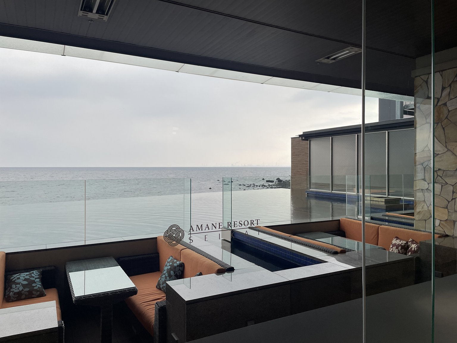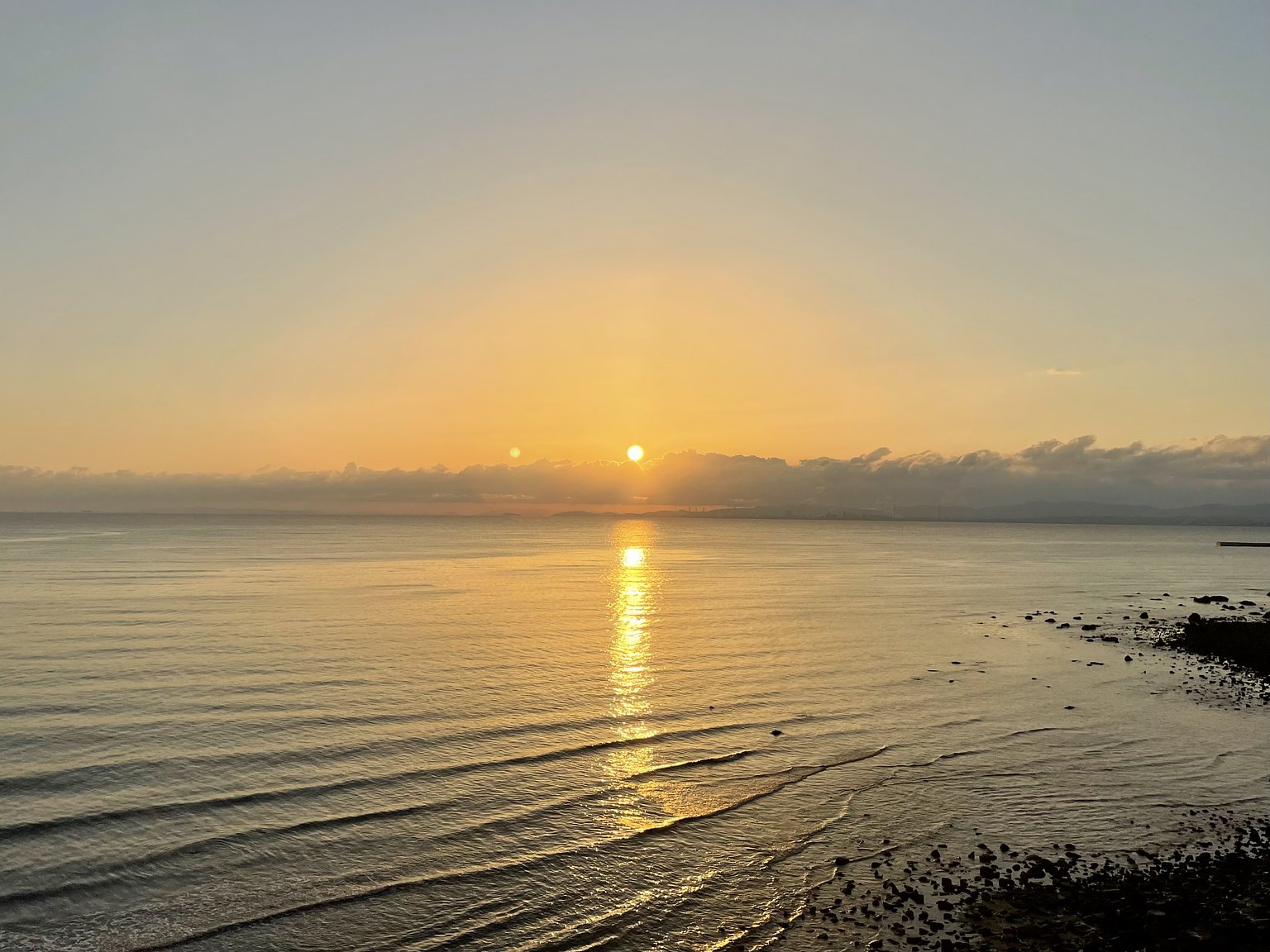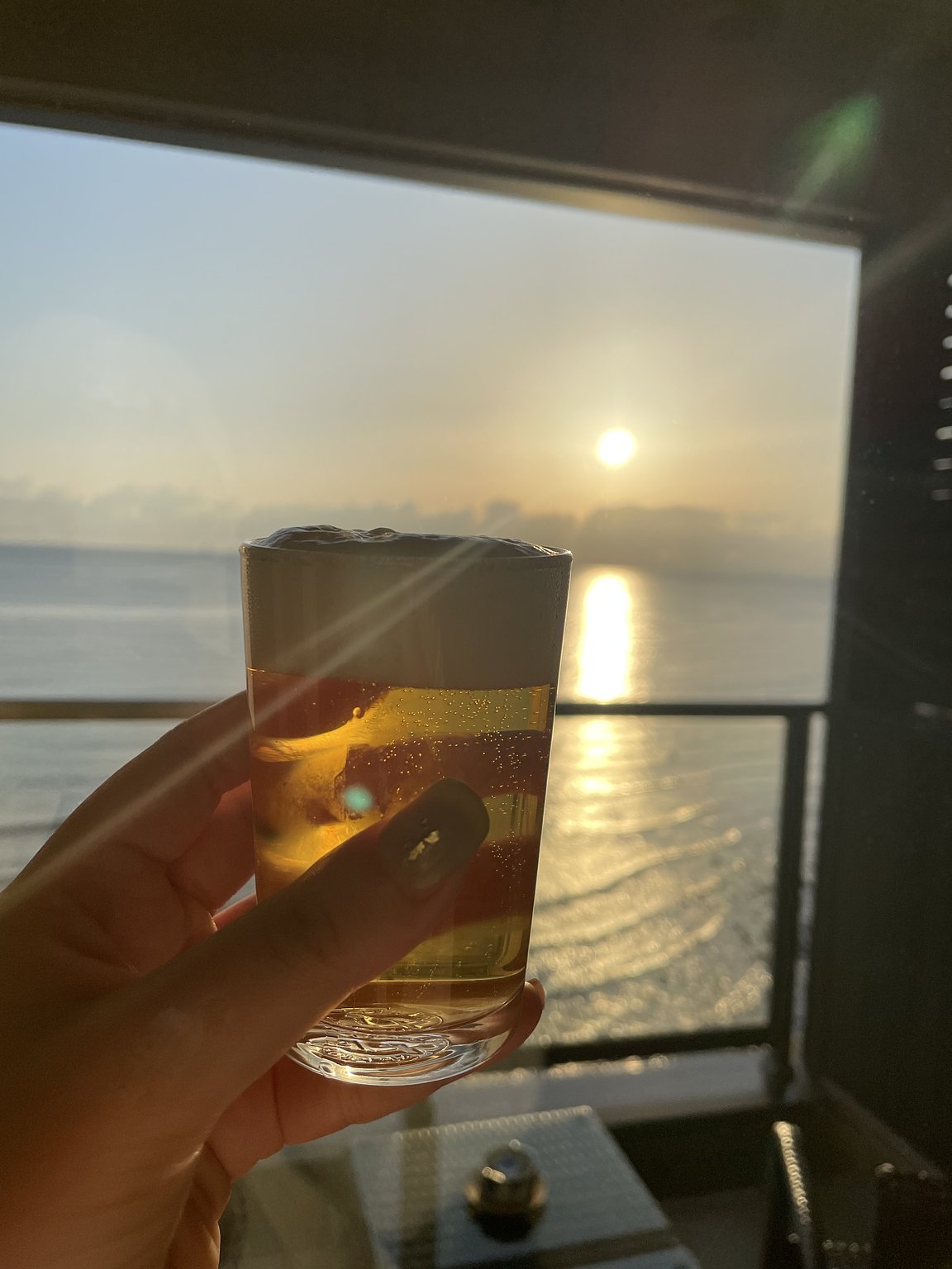 雖然不幸下雨,但我在一間可以俯瞰大海的露天浴缸房間裡感覺豪華。 海上升起的朝陽十分夢幻。
