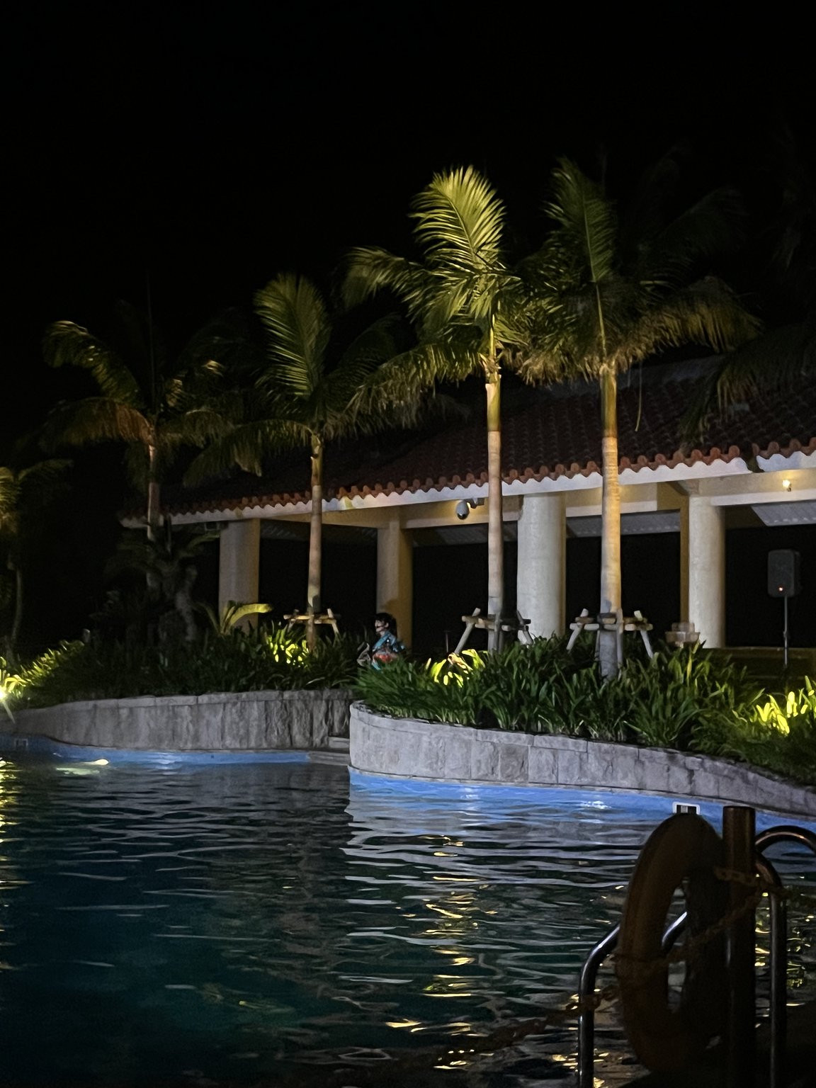 回到酒店後,我們享受了17:00到19:00的小吃和酒……有許多適合孩子們食用的食物,讓我們全家能夠悠閒的度過時光。之後在夜間泳池裡玩得不亦樂乎!有些酒店不允許孩子在晚上使用游泳池,但這裡有適合孩子們的活動,讓孩子們可以玩到精疲力竭。(如線香花火和水槍活動等)