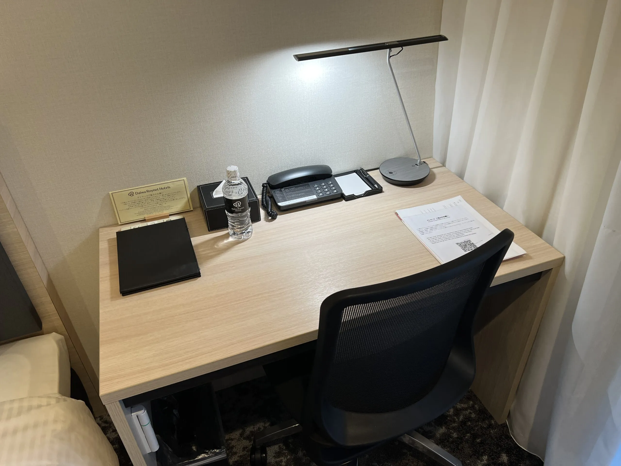 房間裡有一張非常適合電腦工作的桌子。床邊有鬧鐘、插座和USB電源,房間的照明開關也都設有。冷藏庫也有不小的容量。需要注意的是,沒有通電的話冷藏庫是無法運作的。還備有空氣清淨機,在花粉季節時非常好用。