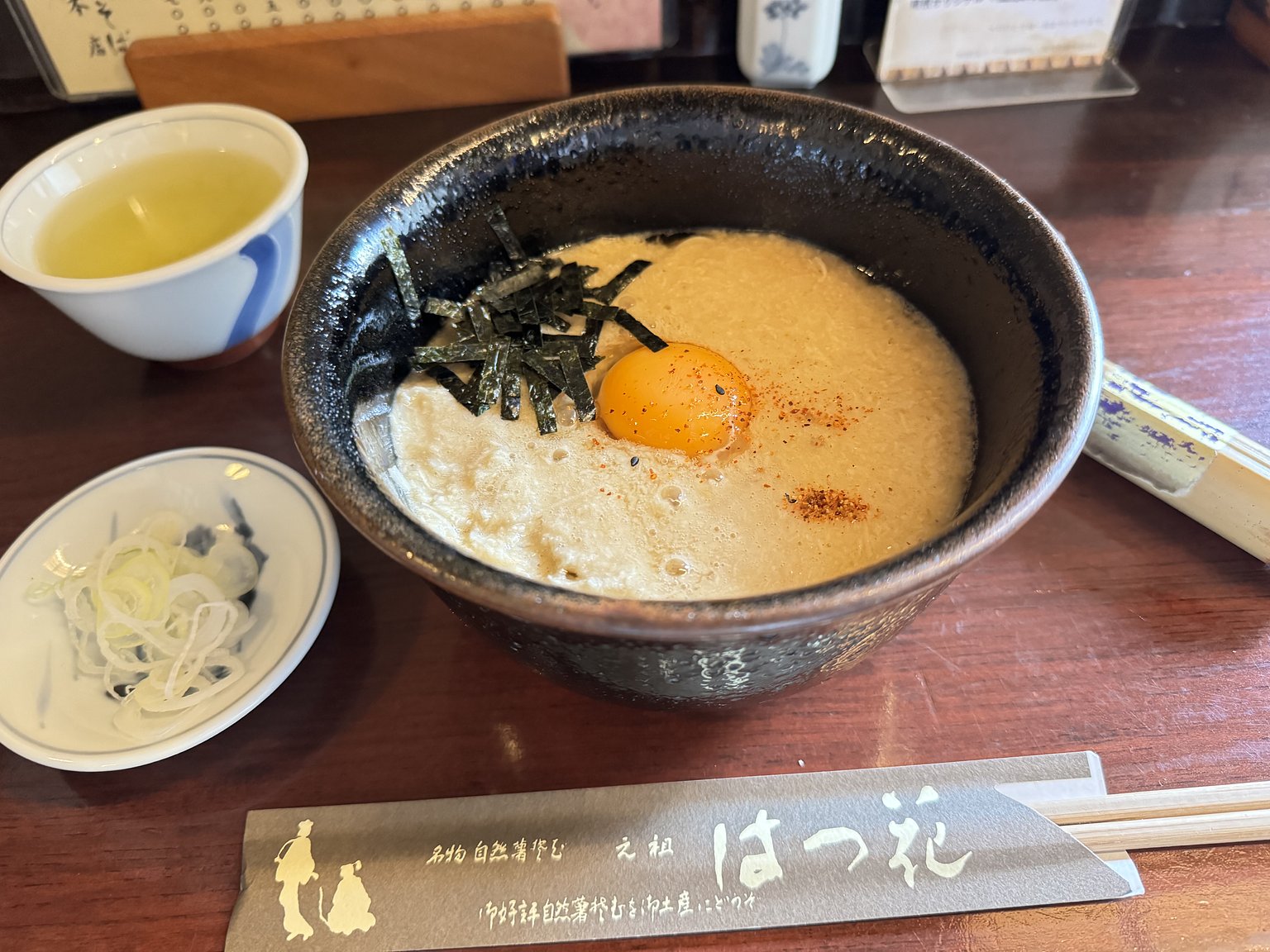 在初花品嚐自然薯蕎麥麵,熱乎乎的山掛真美味♡ 這是用自然薯和雞蛋製作的蕎麥麵。既暖和又滑順好吃。