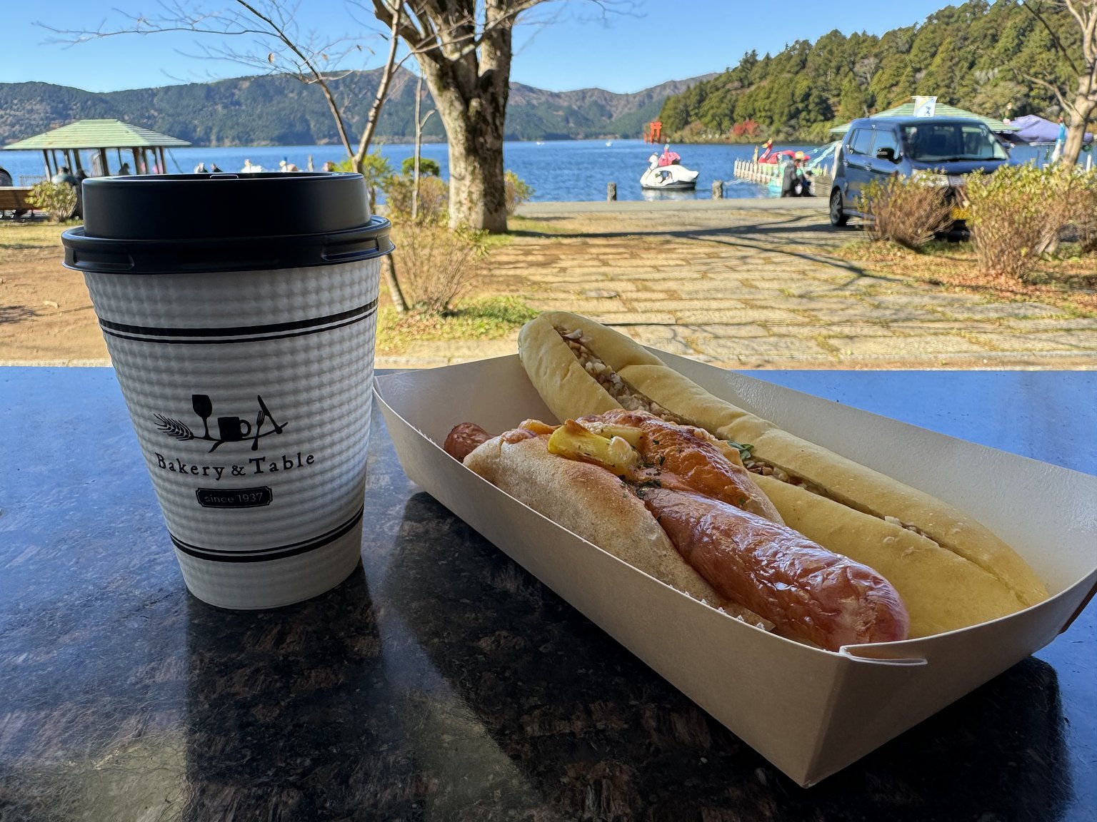 在芦之湖的湖邊浸泡足湯,同時享用美味的麵包。