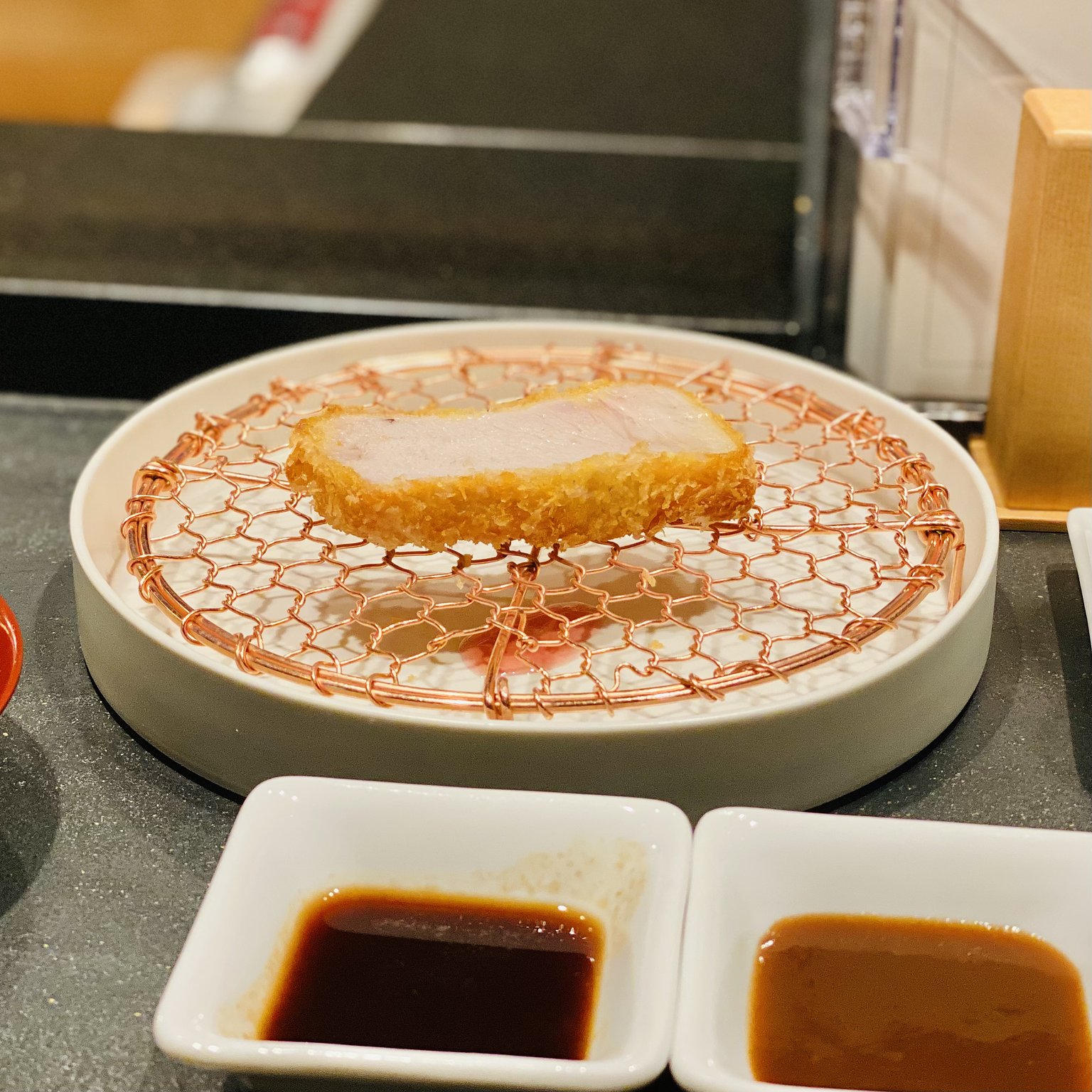 首先上桌的是里肌和肉眼。太過嫩滑了,讓我都懷疑「這真的算豚排嗎?」吃一口就想大喊「豚排界的超級明星,來了!」的美味。而且,吃到一半我開始懷疑「這一邊是里肌還是那一邊是肉眼?」因為兩者都太好吃所以開始困惑。到最後變成「隨便哪一邊都可以」的心情(讚美之詞)。