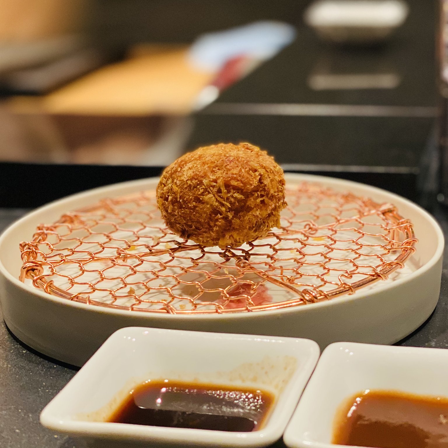 接下來是炸豬肉餅和蟹肉可樂餅。這裡的炸物祭典爆發。外觀幾乎相同,但第五個球體是炸豬肉餅,第六個球體是蟹肉可樂餅。每當咬下酥脆的衣,心裡不禁想著「這,可能是我一生中最愛的味道…」甚至產生「這是蟹肉奶油的暴力嗎?」的想法。