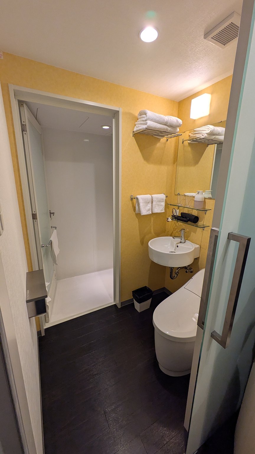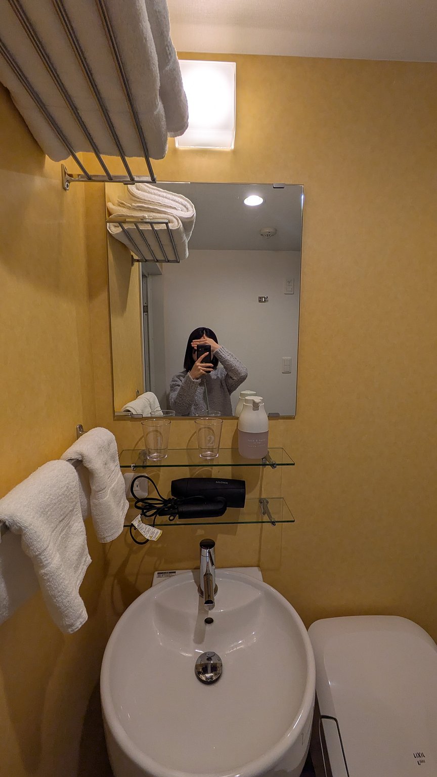 沒有浴缸,只有淋浴。不過除了淋浴,還有上方的水流和側面的水流,這樣的設計很有趣。雖然是冬天,但洗澡時並不寒冷。