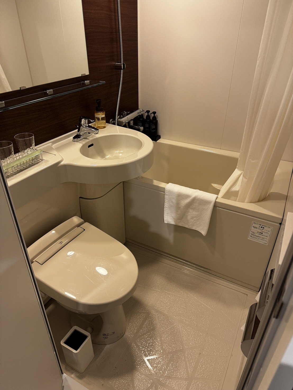 浴室是單元式,但非常實用,設施齊全。淋浴用品設有分配器,讓你可以攜帶最少的行李進住,這是一個讓人感到快樂的優點。